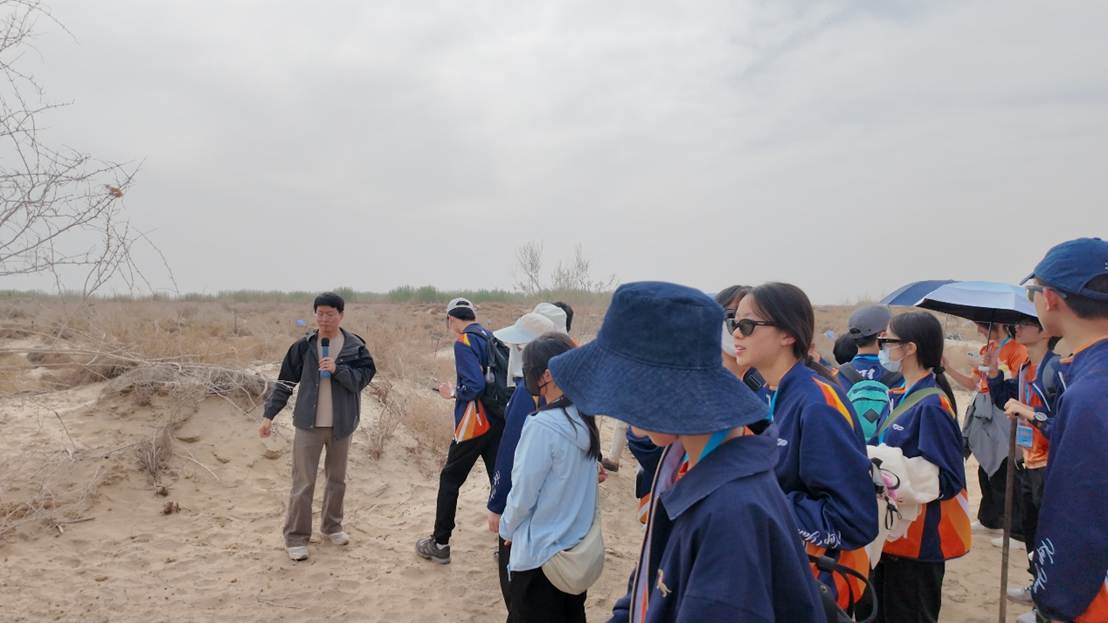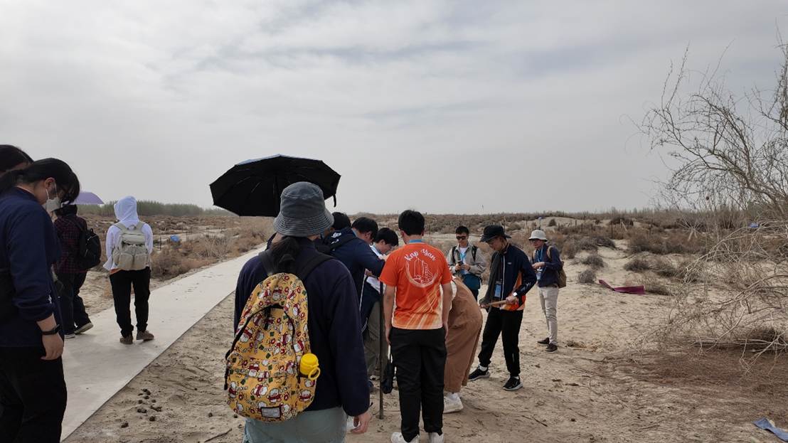 随后,在科研人员的带领下,师生们徒步进入策勒站荒漠—绿洲过渡带天然植被修复和利用技术研发区,学生们近距离观察了荒漠深根植物的根系样本。金谦老师向来访师生介绍了红柳、骆驼刺、沙拐枣等典型固沙植物的形态特征以及深入浅出地讲解了荒漠深根植物如何在极端干旱环境中汲取水分的生长策略。并且,学生们还亲手操作了多种治沙科研仪器、体验了野外采样过程以及深入探究了骆驼刺等植物惊人的耐旱生存智慧。